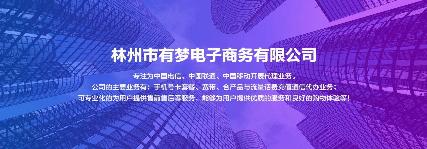 林州市有梦电子商务有限公司,自成立时起一直专注为中国电信、中国联通、中国移动开展代理业务。公司的主要业务有:手机号卡套餐、宽带、融合产品与流量话费充值通信代办业务;可专业化的为用户提供售前售后等服务,能够为用户提供优质的服务和良好的购物体验等。我司在线上销售渠道经营通信业务产品,已经有了多年的经验,包括号卡套餐、宽带办理、融合套餐、老用户维系、流量充值、话费充值等。